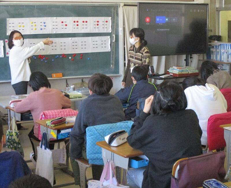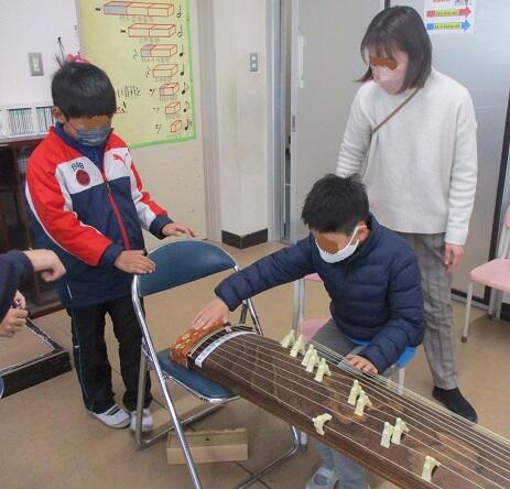 音楽室では、4年生が筝(そう)の演奏を体験しています。以前は5年生の活動だったように思いますが今は…。