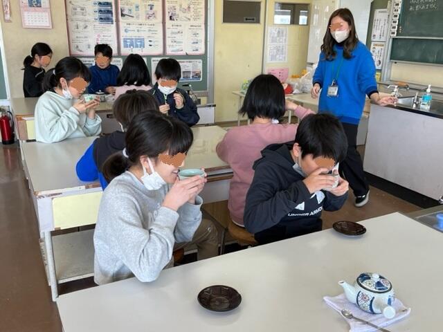5年生が家庭科でお茶を淹れて飲みました。水や茶葉の量、濃さが均一になる注ぎ方など、火傷にも気をつけて順序だてて進みます。日本茶を急須から淹れて飲む経験のない子が多いのでしょう。「苦い」と顔をしかめている子があちらこちらにいます。