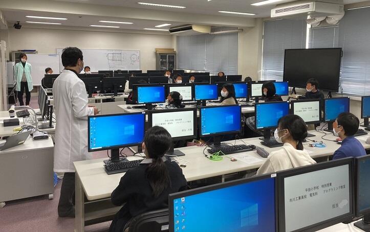 高校との連携で、6年生が市川工業高校電気科に赴いてプログラミングについて学びました。ライトの明るさや点灯のタイミングなどをPC入力しながら試行錯誤します。