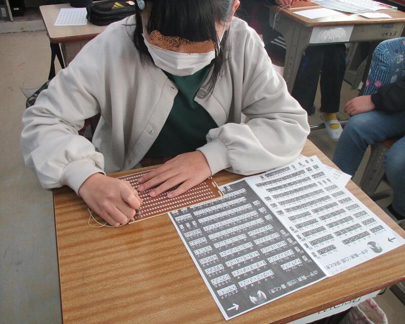 5年生は、社会福祉協議会の皆さんの指導の下で点字体験をしています。