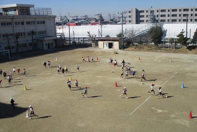 よく晴れた校庭では、2年生がサッカーにつながるボール遊びを全力で行っています。