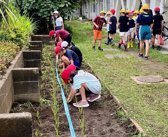 5年生がプール脇の田んぼに苗を植える5年生。先週はお米マイスターの牧野さんにいろいろ教えていただいて今日を迎えています。植えっぱなしにならないよう、しっかり管理してほしいです。
