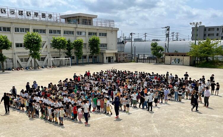 延期に次ぐ延期で3度目の正直の今日、晴天の中を子供たちがコククジラの図案をもとに広がって待機している写真。10時過ぎにセスナが上空を旋回し始めると、頭上に色工作用紙をかざして撮影をしました。写真の下方が鯨が吹く潮になります。どんなふうに撮れたかはお楽しみ。ちなみに全校児童が校庭に集まって撮る集合写真は後日!