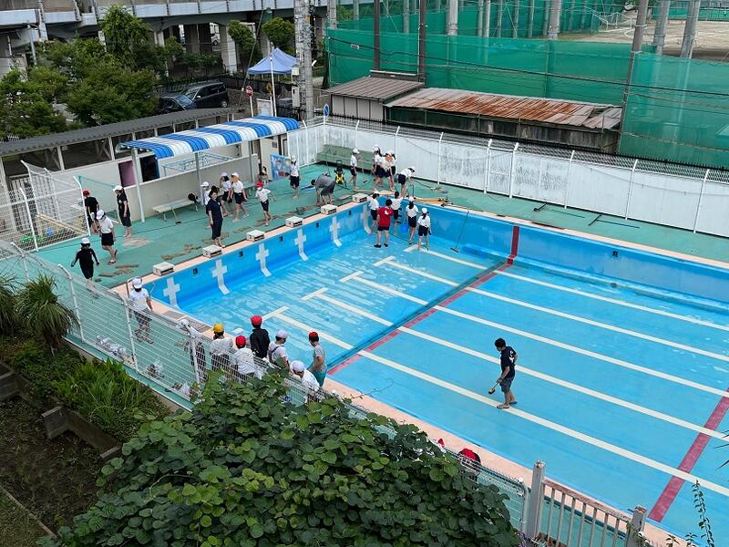 傍目には暑すぎない天気の中でのプール掃除です。午前中は地域の方や保護者の方にお手伝いいただきました。午後は6年生がクラスごとできれいにしてくれました。工事業者の方にもご協力いただき、無事明後日のプール開きを迎えられそうです。あとは当日の天気次第!