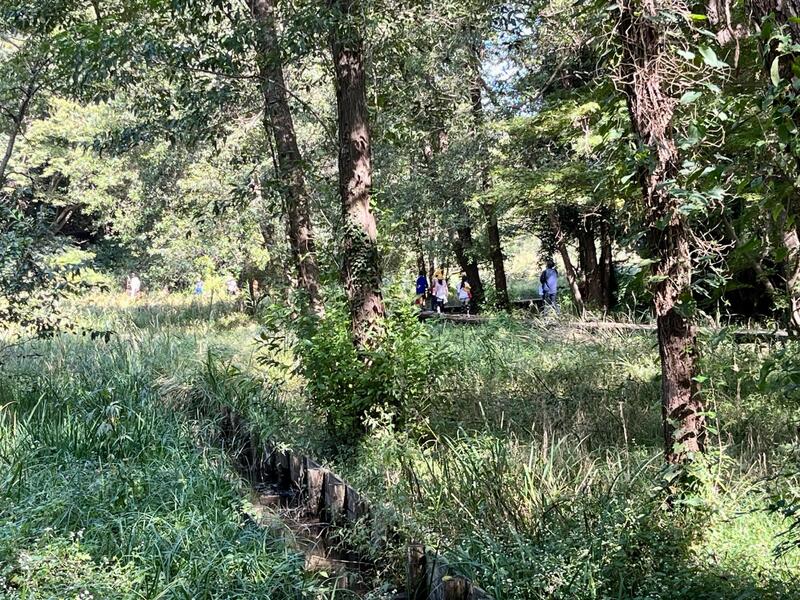 10:35 木陰が広がる園路を歩いています。梨畑に降った雨が地下水として貯えられ、湧水となって自然観察園の湿地を潤しているのです。