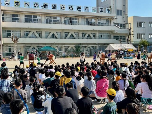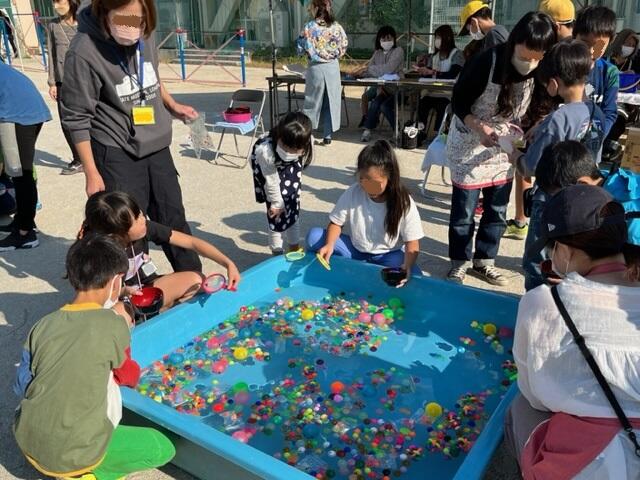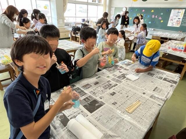 1,2年生、たんぽぽ、4くみ合同で、ジャンボシャボン玉作りの体験をしました。名人の中村さんがコツを教えてくれたり、一人一人にアドバイスしたり…。人数が多いので舞い上がるシャボン玉の数もものすごい。