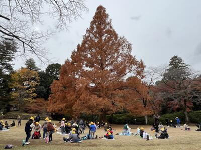 清水公園でお弁当を食べ始めました。このー木なんの木、気になる木〜。