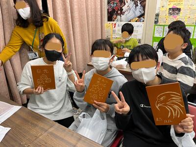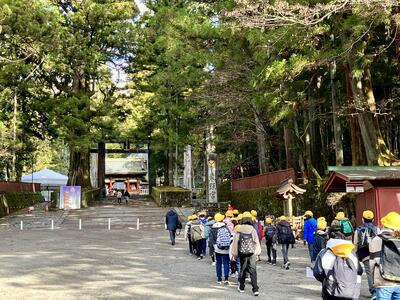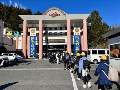 12:50 たっぷり楽しんだ子供たちは、木刀や刀を手にバスに乗り込みました。次は日光彫体験です。青空です。
