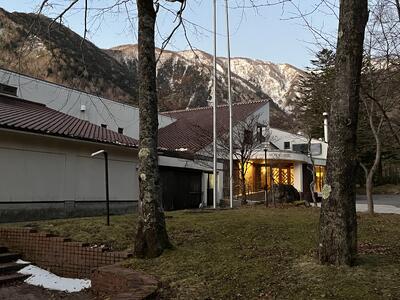 16:45 すべての行程を終わらせてホテルに着きました。バス酔いもなくみんな元気です。ホテルの奥の山には雪が見られます。