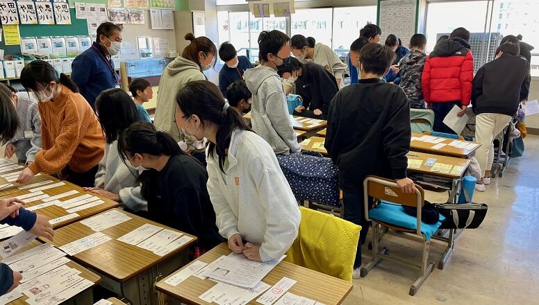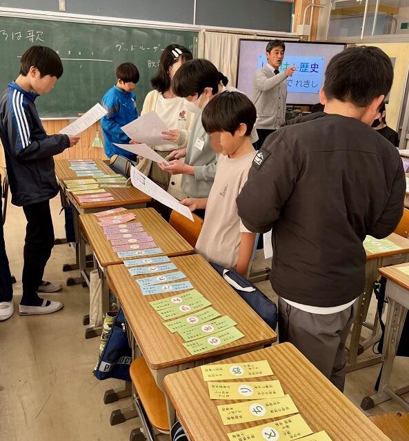 いろは48の歌や歴史上の出来事などが書かれた「いろはde歴史」カードを活用して、歴史に関する自分が持っている知識と、あるいは新しい知識を紡いでみる授業を6年生が行いました。指導者は、千葉大学教授の松井先生。ゲーム感覚で進む授業に興味津々の様子。あっという間に45分が過ぎてしまいました。