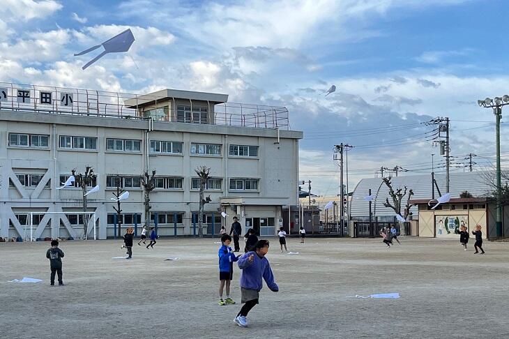 さむ~いという感じではない午前中、校庭で凧あげする1年生の姿が見られました。そういえば先日教室で本体に思い思いの絵を描いていました。風がないので、走って凧を浮かせています。多分凧のあげ方も知らないのだろうなぁ。凧あげならぬ「凧引き」です。糸が絡まったら大変ですから、ほらっ広がってね~。