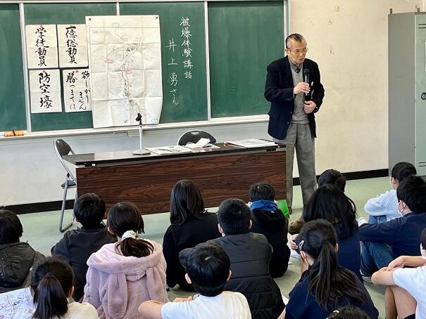 市川被爆者の会メンバーで、被爆体験の語りべをされる井上さんをお招きして、6年生がお話を聞きました。生々しい体験談や写真などに、子供たちは食い入るように耳を傾けています。何を感じたかは人それぞれですが、これをさらに後世に伝承していくことができたら…と思います。