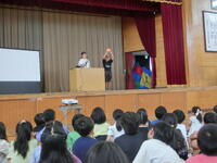 その後、今年の夏、甲子園に出場した県立岐阜商業高校の横山 温大(よこやま はると)さんについて話をしました。生まれつき左手の指がない横山さんが、兄や姉が野球する姿にあこがれて野球をはじめ、ハンディキャップがあっても一生懸命努力し、目標だった甲子園出場をレギュラーの選手として果たしたことを伝えました。
