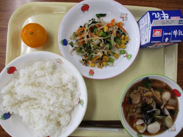 ご飯、八宝菜、じゃことコーンのナムル、冷凍みかん、牛乳