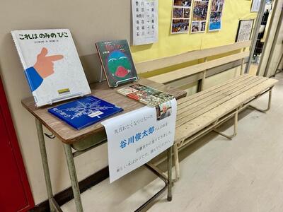 校長室前に、亡くなった谷川俊太郎さんの本を数冊集めてみました。ベンチも運んできて、座って読めるようにしてみました。