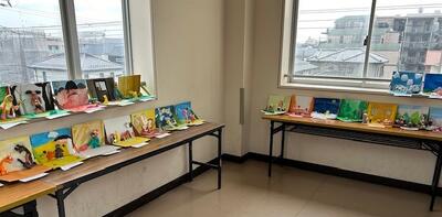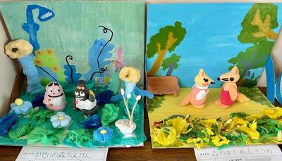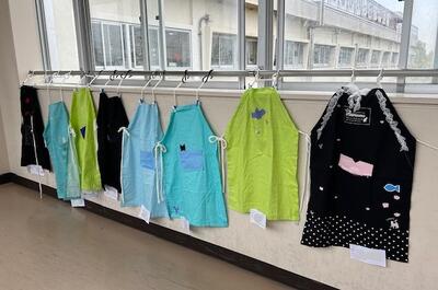 第1校舎と第2校舎をつなぐ渡り廊下は2階も3階もギャラリーになっています。3階には4年生の図工作品、好きな本の中の秋に入りの場面を紙粘土で表した『本の中から飛び出した物語』が。その隣には、5年生が作ったエプロンが…。授業参観の折にぜひご覧ください。