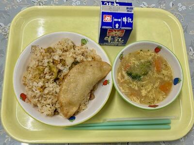 ボーノ(11/7) 投稿日時 : 2024/11/07 平田小学校管理者 キムチごはん、餃子、中華風コーンスープ、牛乳 ジャンボ揚げ餃子です。パリパリの皮の中には、ニラの味などがよい感じの具が多すぎず少なすぎずで、トータルでおいしい。ごはんに混ぜられたキムチは主張しすぎず、どちらかというと控えめですが、ゴマが全体をコーディネートしています。スープも心と体を温めてくれます。