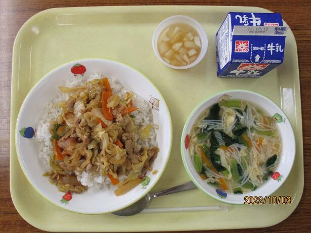 麦ごはん、回鍋肉、ビーフンスープ、りんごゼリー、牛乳