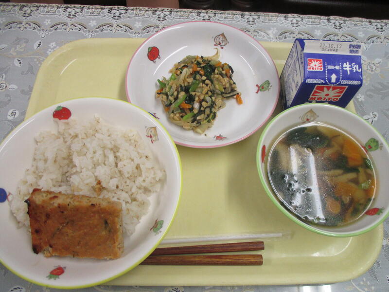 麦ごはん、ツナのさんが焼き、秋のけんちん汁、納豆和え、牛乳
