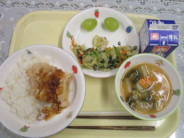 ごはん、鶏肉の薬味ソースかけ、田舎汁、ゴマ酢和え、ブドウ、牛乳