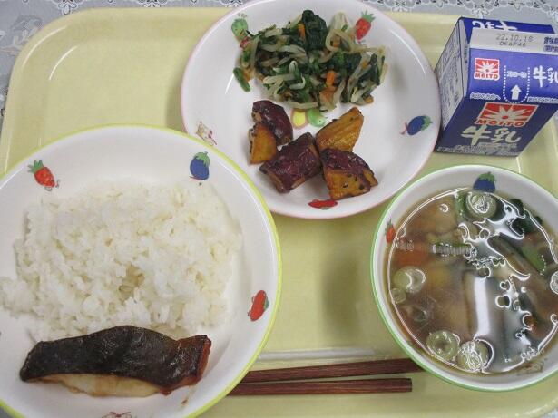 ごはん、銀だらの味噌焼き、辛し和え、大学芋、だまこ汁、牛乳