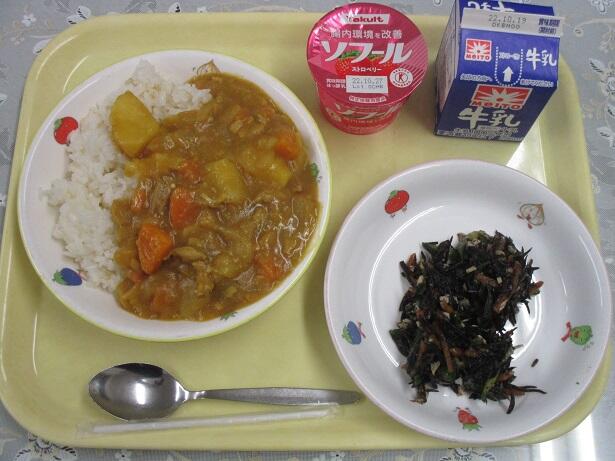 玄米ごはん、チキンカレー、ひじきのマリネ、ヨーグルト、牛乳