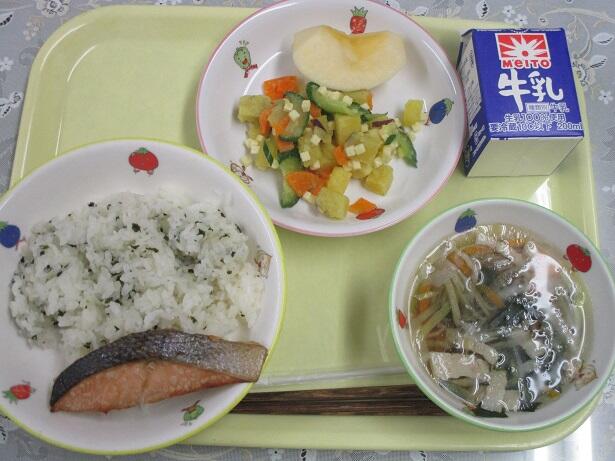 わかめごはん、鮭の生姜焼き、沢煮椀、サツマイモサラダ、りんご、牛乳