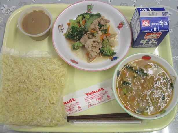 味噌ラーメン、豚肉とゆで野菜のサラダ、カフェオレゼリー、牛乳