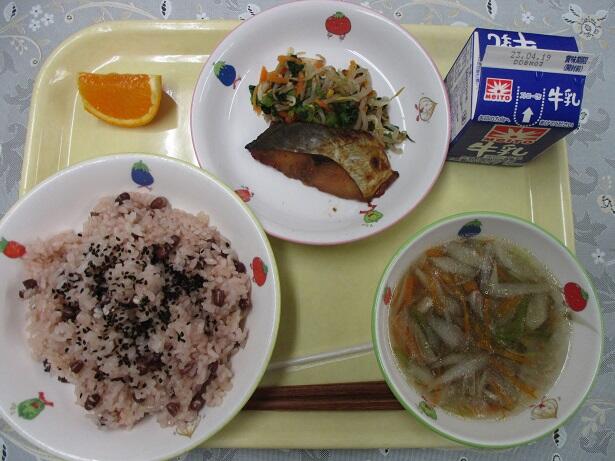 赤飯、さわらの味噌焼き、沢煮椀、おかか和え、オレンジ、牛乳