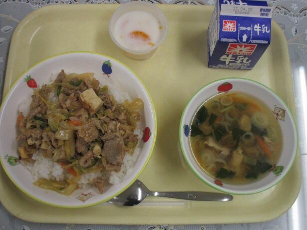 焼き肉丼、春雨スープ、杏仁豆腐、牛乳
