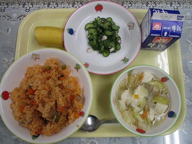チキンピラフ、肉団子スープ、たこキュウリ、バナナ、牛乳