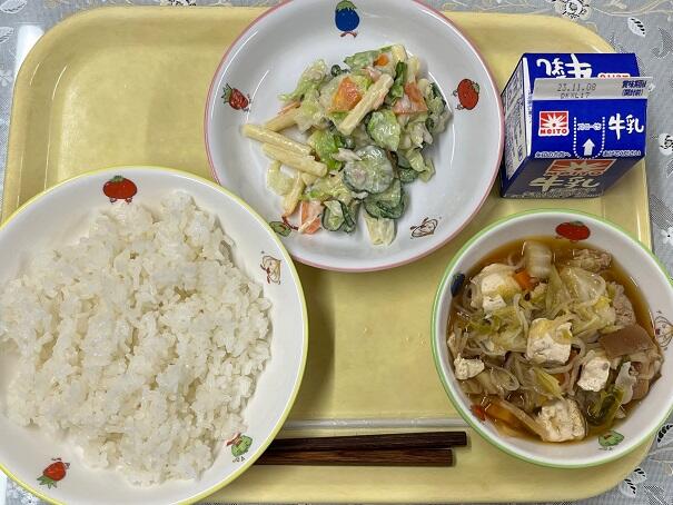 白菜や大根、麩が汁を吸っておいしく仕上がっています。甘すぎず濃すぎず、その加減がちょうどよい。色どりがきれいなマカロニサラダは、エッグケアマヨネーズを使用してしっとり。