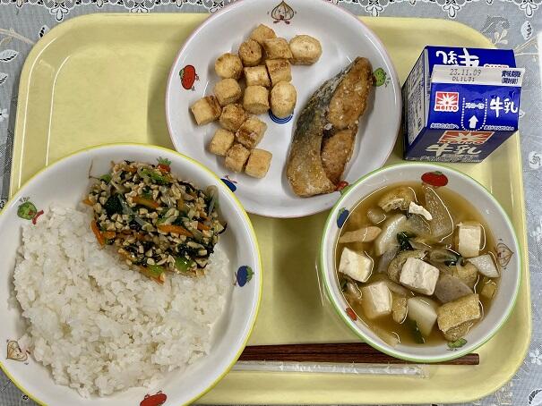 ごはん、ブリの竜田揚げ、納豆和え、けんちん汁、麩のシナモンシュガー、牛乳