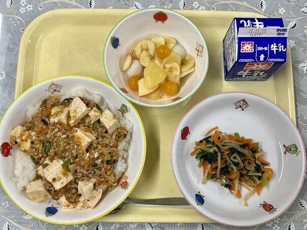 麻婆豆腐丼、ナムル、フルーツ白玉、牛乳