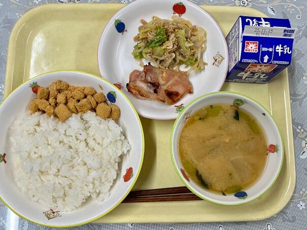 ごはん、鶏肉のみそ漬け焼き、ツナとキャベツの和え物、大根と厚揚げの味噌汁、きなこビーンズ、牛乳