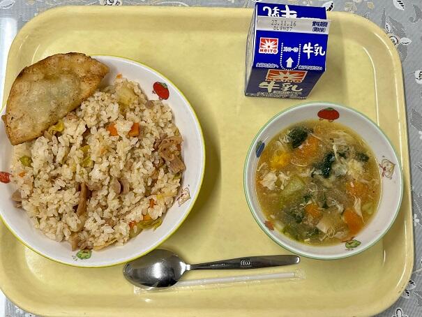 ごはんはキムチの風味が香りますが、比較的あっさり系。餃子は具がたっぷりで、厚めの皮もカリッカリ。スープはしっかりした味に仕上がっています。検食分にはコーンが数粒でしたが、教室に届く食缶にはたっぷり入っているのでご安心を!
