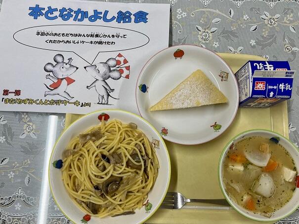 今日は読書週間のイベントの一つ、「本となかよし給食」です。絵本『またねずみくんとホットケーキ』にアイディアを得て献立が出来上がっています。エノキ、しめじ、舞茸、マッシュルームという4種のきのこの味を最大限に生かすために、敢えて薄めの味にしています。煮込みの旬はカブ、そして厚揚げが玉ねぎやジャガイモと口の中で融合!ケーキはシンプルですが、丁寧でおいしです。