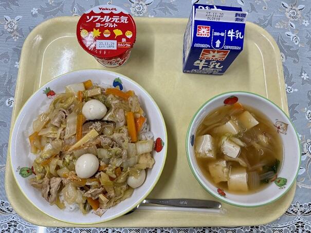 麦ごはん、中華丼の具、チンゲン菜のスープ、ヨーグルト、牛乳