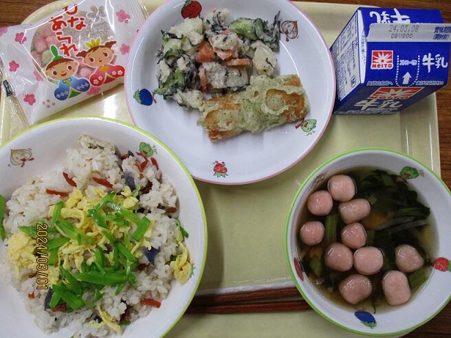 ちらし寿司、竹輪の磯部揚げ、すまし汁、ひじポテサラダ、ひなあられ、牛乳