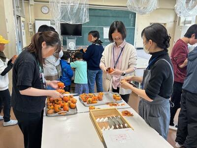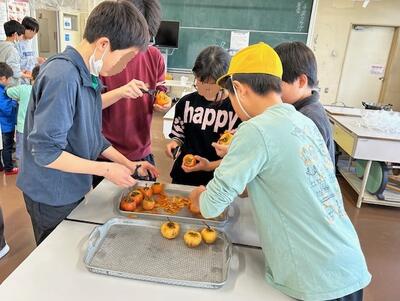 放課後に「シブがき隊」の数名が家庭科室に集まりました。(1)ヘタのヘリの部分を取り除き、(2)包丁でヘタの周りを剥いて、そのあと(3)ピーラーで皮むき。吊るし紐を通してから、一度熱湯に浸して洗濯物を干す器具にぶら下げました。第2図書室のベランダに置いて、乾燥させます。管理も含めて、まだまだやることはたくさんあります。