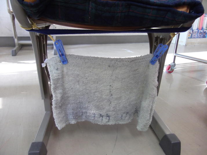 イスの後ろ側には、写真のように、ぞうきんをかける洗濯バサミを2つ、つけます。