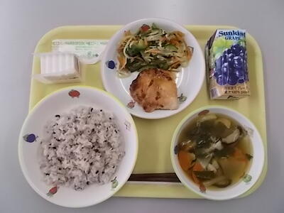 献立:黒米ごはん 鶏の照り焼き すまし汁 千草和え お祝いケーキ ぶどうジュース