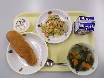 献立:きな粉揚げパン 野菜の洋風スープ 焼肉サラダ ババロア 牛乳