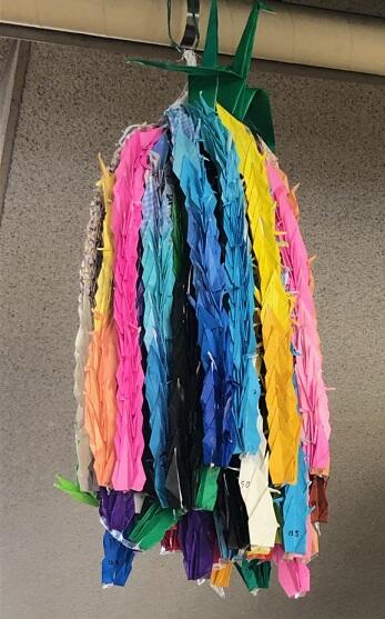 昨日の業間休み、校長室の扉をノックする音に、「どうぞ~」と迎い入れたのは4年3組の10人以上の子供たち。男の子も女の子もいます。なんだろうと思っていると、大きな袋から千羽鶴が現れました。この瞬間、私の頭の中は「???」状態。すると、「コロナが早く終わるように千羽鶴を折りました。飾ってください」と言います。クラス全員ではなく有志だというから驚きます。よく見ると、鶴のいくつかに数字が見えます。397、512、846…。ちゃんと数えて糸を通したのです。