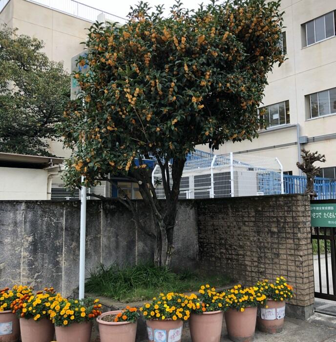 約一か月前、9月に入っても夏日が続き、「暑い~」と顔をしかめていたのに、朝は長袖のYシャツに上着を羽織る日が増えてきました。きちんと季節は巡っていくのだと、今更ながらに思う今日この頃です。そして、先週末に初めて感じたキンモクセイの香りが、数日の間に強さを増して漂ってくるようになりました。どこだどこだ?と周りを見渡し、木を確認!市川小にも14号門を入ってすぐ右と正門の左右にオレンジ色の小さな花が咲き誇っています。もう少しすると根元のコンクリートがオレンジ色のじゅうたんに染まります。ただ、このキンモクセイ、花と香りの季節しか注目されない気がします。常緑ですが、正直かわいいと感じません。だから、我が家の庭には姿はなく、ご近所の香りを楽しませてもらっています。