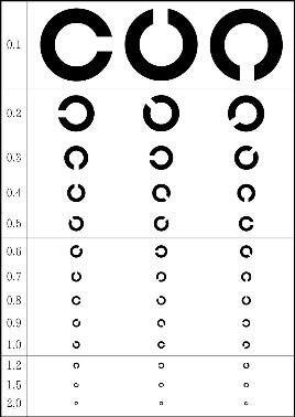 視力とは、ランドルト環の開いている方向を識別することによって、2点が離れていることを見分けられる最小の「視角」を測定するものなのだそうです。日本では直径7.5mm、太さ1.5mmの円の一部が1.5mm幅で切れている環を5m離れたところから見て正確に切れている方向が分かる能力を「視力1.0」としているといいます。 よく理解できませんが、視力1.0以下では0.1の差は大きいものの、1.0を超えるとその差が小さくなるため、例えば1.1を測る必要性がないというのです。