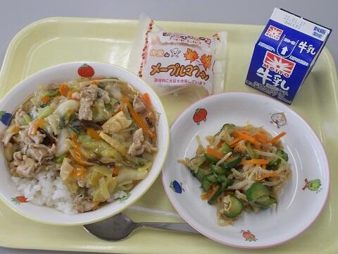 ショウガが香る(1/20) 投稿日時 : 2022/01/20 市川小学校管理者 ごはん、中華丼の具、もやしの味噌ドレ和え、メープルマフィン、牛乳 中華丼はショウガの味が広がって体がポカポカしてきます。このほかに、豚肉、人参、玉ねぎ、筍、きゃべつ、ニンニク、木耳が入っていて栄養満点!