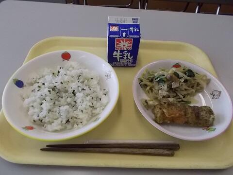 色は地味だが味はよい(10/4) 投稿日時 : 2021/10/04 市川小学校管理者 わかめごはん、ちくわの磯辺揚げ、野菜炒め、牛乳 わかめと小松菜と青海苔の緑があるものの、彩りが少し足らないかもしれません。でも味はバッチリ!