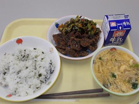 わかめごはん、クジラの竜田揚げ、磯香和え、かきたま汁、牛乳