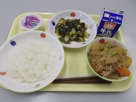 やっと秋らしく…(10/12) 投稿日時 : 2021/10/12 市川小学校管理者 ごはん、肉じゃが、海藻サラダ、ゼリー、牛乳 急に秋らしい気温に下がってきたように感じます。すると、温かい汁物や熱々の肉じゃがは一層おいしく感じます。